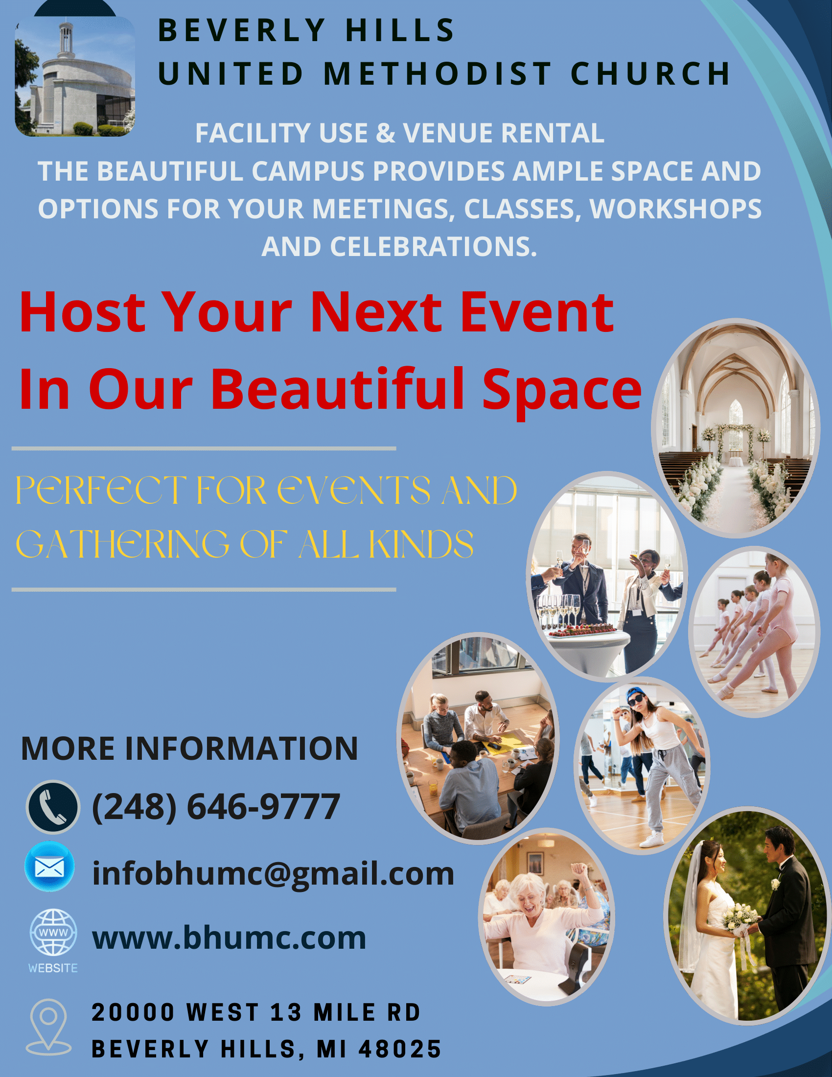 Weddings • Music classes and recitals • Concerts • Community meetings • Weekday seminars • Training conferences • Dance and exercise classes • Parties • and More!